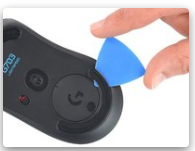 Desliza la púa de apertura bajo el borde del pie inferior del ratón y asegúrate de que tu púa se deslice bajo ambas capas del pie.